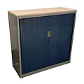 Tweedehands Aspa roldeurkast met zilvergrijze romp en blauwe roldeuren. Melamine topblad, Eiken dessin.